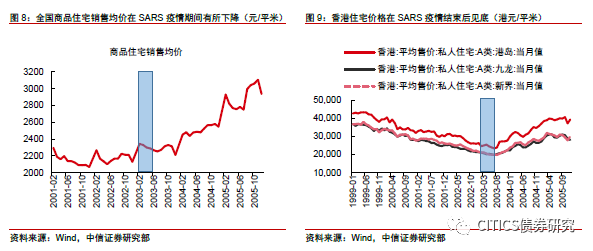 房地产价格在SARS疫情爆发期间有所下行。香港楼市自东南亚金融危机后至2003年上半年,一直处于下跌之中。随着2003年SARS疫情的爆发和消灭,香港住宅价格也走完了下跌的最后一程。2003年6月,SARS疫情确认消灭,7月香港住宅价格创下过去20年来的历史低点。