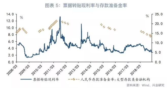 我们注意到,2018年以来,央行多次采用调整存款准备金率这一数量型货币政策工具,我们此前的报告也提到未来还有继续降准的空间。存款准备金率的调整对银行间的流动性有直接的影响,进而会影响货币市场资金利率,从而可能对票据转贴现利率的走势产生影响。一般而言,当央行提高存款准备金率的时候,货币市场流动性收紧,资金利率可能上行并带动票据转贴现利率上行;央行降低存款准备金率,银行间流动性宽松,票据转贴现利率则具有下行的动力。历史经验表明,存款准备金率的变化与票据转贴现利率的走势具有一定的相关性,存款准备金率连续上调,票据转贴现利率上行,存款准备金率连续下调,票据转贴现利率进入下行趋势。