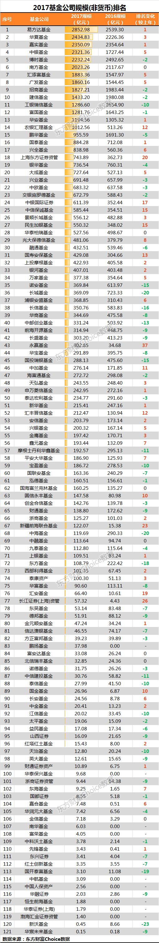与此同时,2017年百大公募基金公司规模(非货币)排名出炉。根据东方财富Choice数据统计,2017年全年: