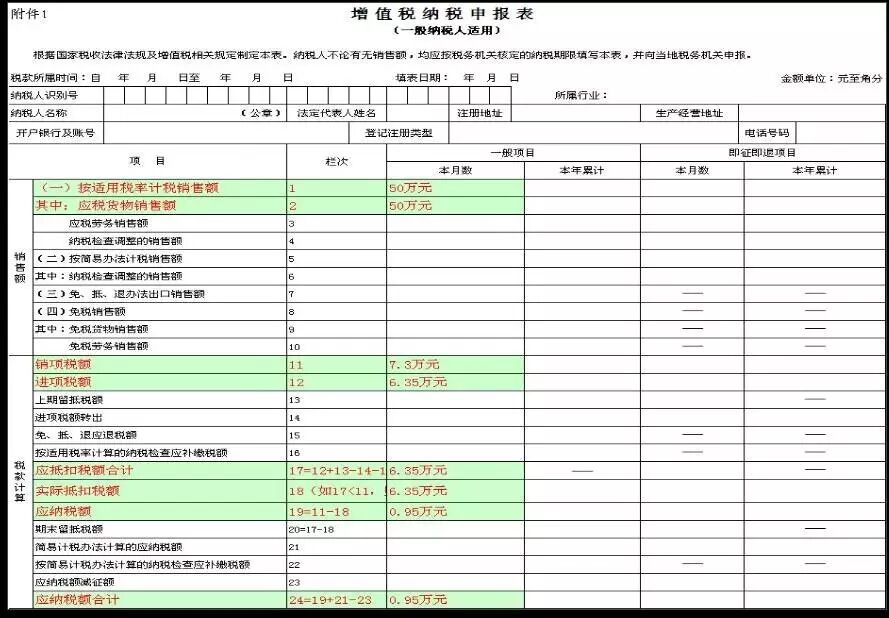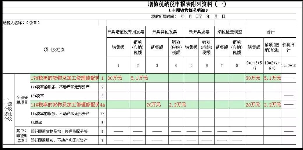 附表一:原“11%税率”栏次调整为两栏,分别为 “11%税率的货物及加工修理修配劳务”和 “11%税率的服务、不动产和无形资产”。