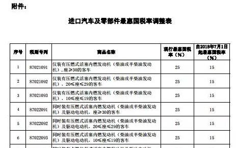 2018年5月22日国务院关税税则委员会印发公告,经国务院批准,自2018年7月1日起,将税率分别为25%、20%的汽车整车关税降至15%,降税幅度分别为40%、25%;【查看详情】