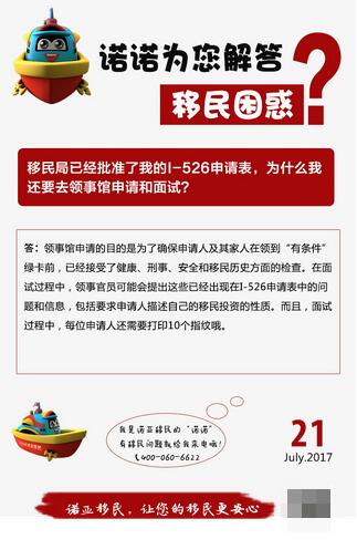 问:移民局已经批准了我的I-526申请表,为什么我还要去领事馆申请和面试?答:领事馆申请的目的是为了确保申请人及其家人在领到“有条件”...【查看详情】