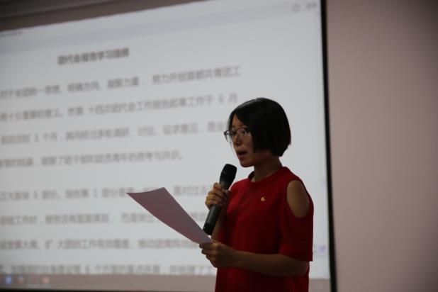 图为:91金融团总支宣传委员哈胜楠领读《团代会报告学习提纲》