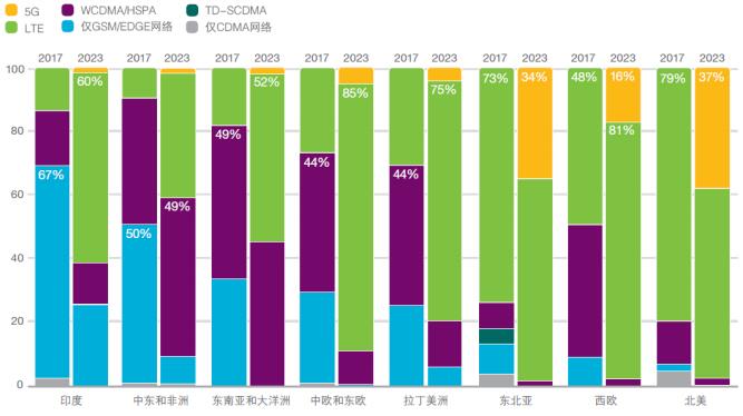 北美地区目前拥有最高的LTE用户占比,将近80%,这一趋势将延续到5G,预计到2023年,北美地区的5G用户占比将达到37%。包括中国、日本、韩国在内的东北亚区,2023年5G用户占比将达34%。从图表来看,北美和东北亚地区,将是5G发展最为迅速的区域。