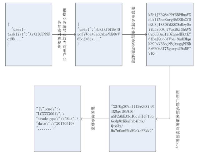 本次采用的是RSA的加密算法,虽然它加密慢,但是由于它的特性是密钥对存在,可以很好的用于业务数据加密KEY的加密,给每个参与方都加密一份key的加密数据这样各个参与方都能够用自己的私有密钥去解析得到对称KEY从而解析出真正的业务数据,从而达到数据的部分可见,如果需要使用国密算法的话可以用国密SM2算法来替代。